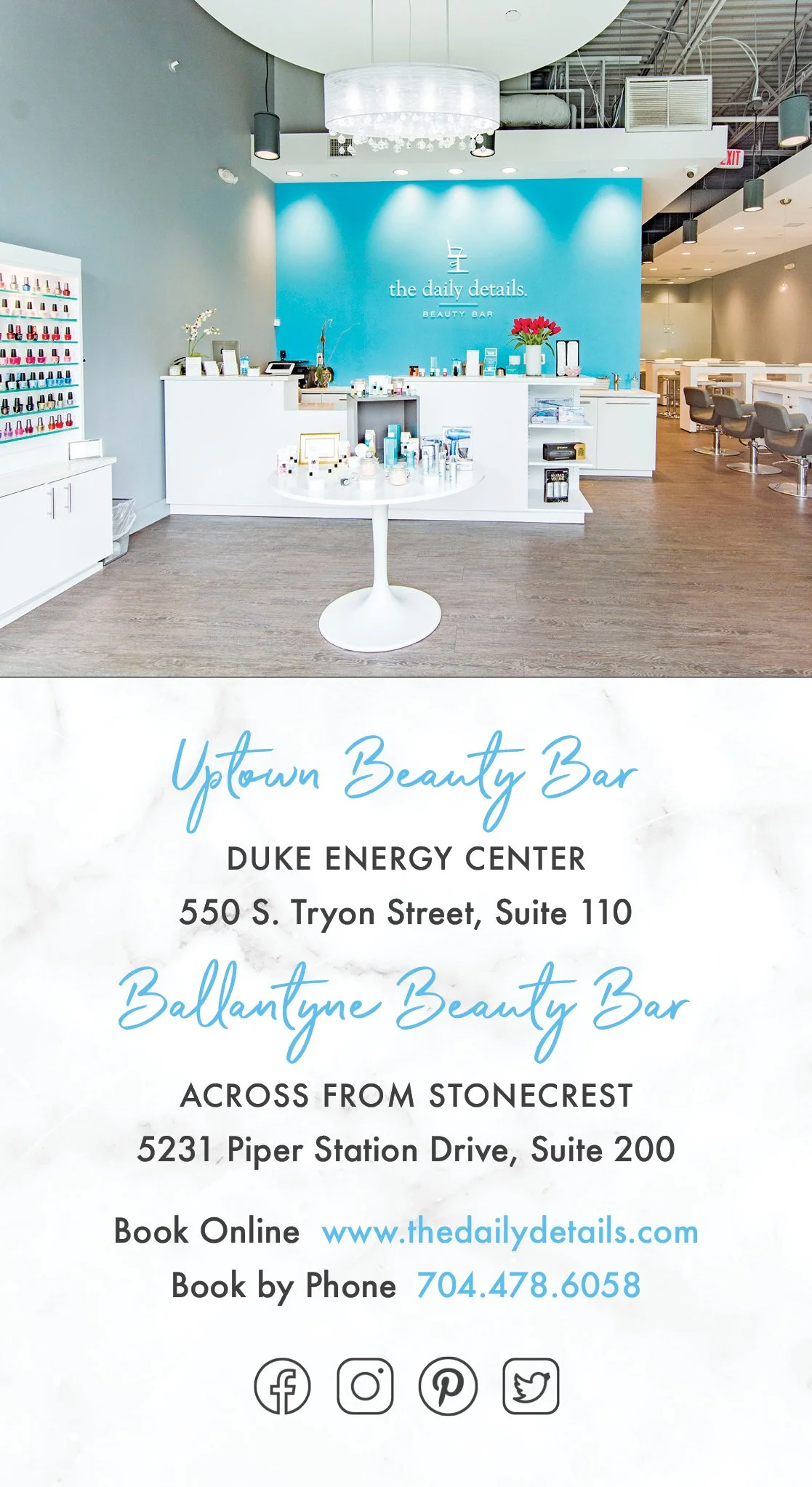 “The Daily Details has two upscale beauty bars in Charlotte offering: blowouts & hair-styling, manicures & pedicures, facial waxing, and make-up application for the modern woman on the go.”